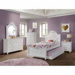 Picket House Furnishings Annie Twin Platform 3PC Bedroom Set is what little girl dreams are made of. This group offers a sense of wonder, featuring delicate bow moldings throughout, a button-tufted, white faux leather headboard, and sparkling crystal-ball posts. Make fairy tale dreams come true today by adding the Annie Twin Platform 3PC Bedroom Set.