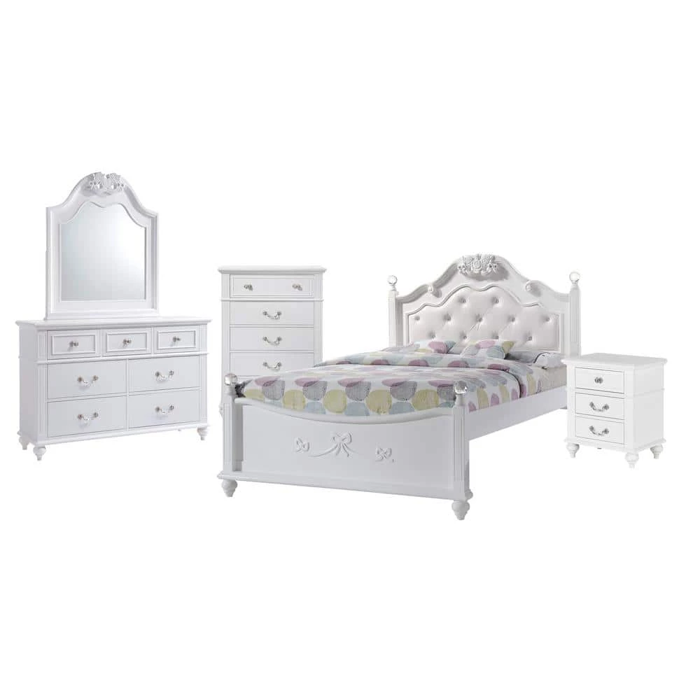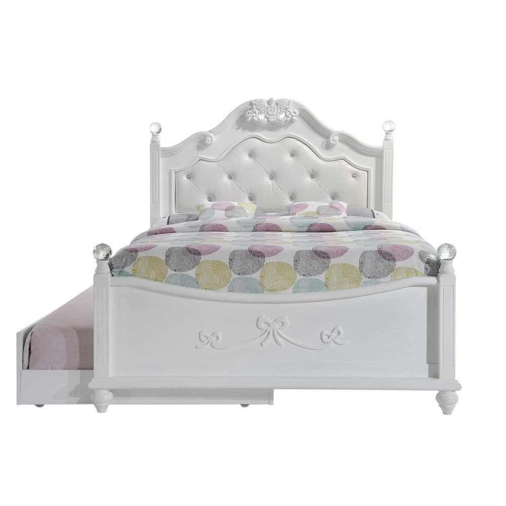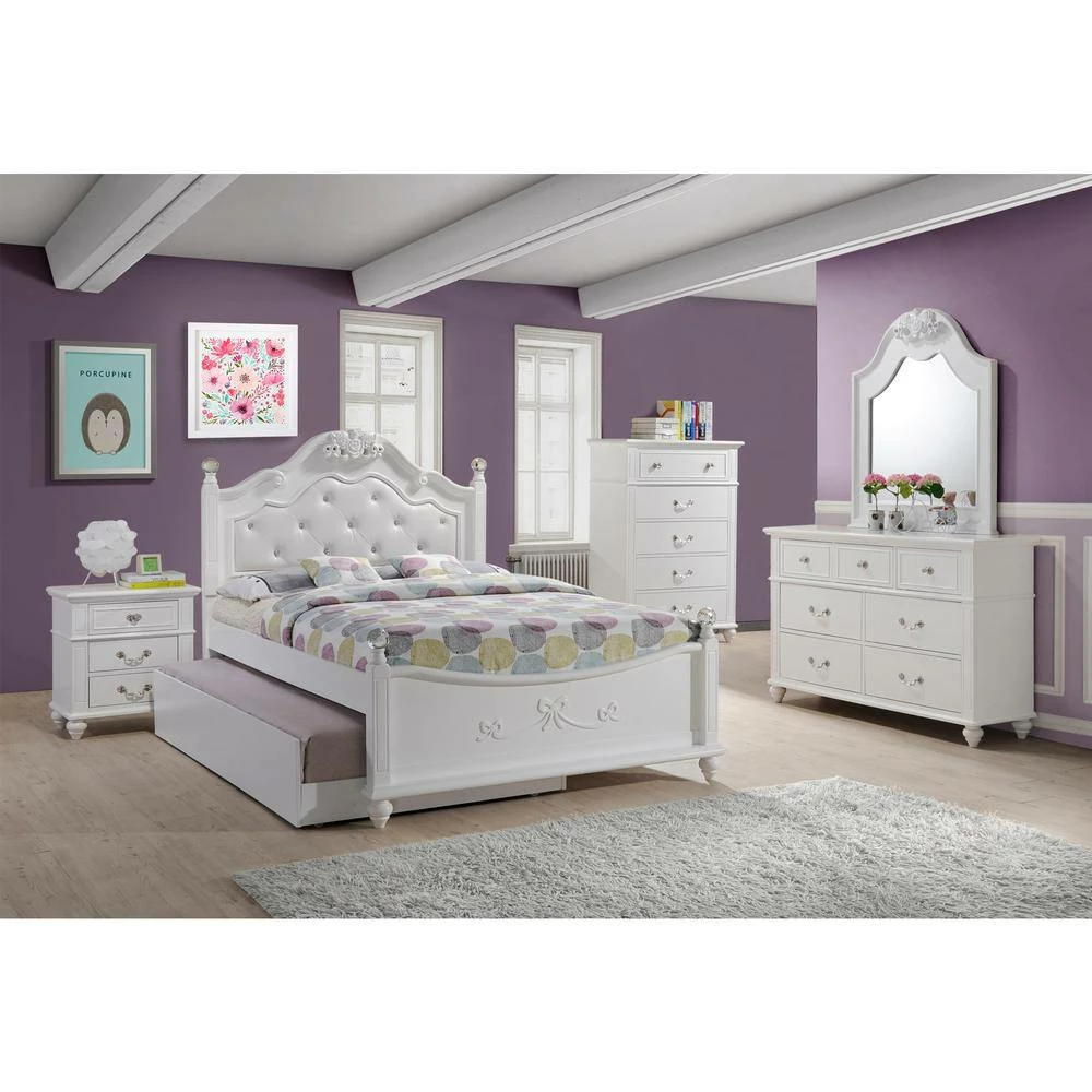 Picket House Furnishings Annie Full Platform 5PC Bedroom with Storage Trundle is what little girl dreams are made of. This group offers a sense of wonder, featuring delicate bow moldings throughout, a button-tufted, white faux leather headboard, and sparkling crystal-ball posts. This well-crafted, beautiful design offers a convenient trundle, keeping your little one organized.