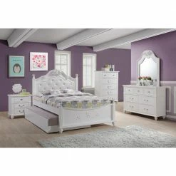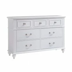 The Picket House Furnishings Annie 7-Drawer Dresser is the perfect addition to your little one’s bedroom. This horizontal dresser comes with seven, spacious drawers; perfect for keeping all of your belongings neatly stored away. The bottom drawers feature a dust proofing layer to help keep your belongings in great condition. The 4-bottom dressers are the perfect size for storing away more bulkier items, like sweaters. The crystal-like drawer handles and knobs pair beautifully with the clean, white finish. Bevel edges and cabriole feet complete the look of this transitional design.