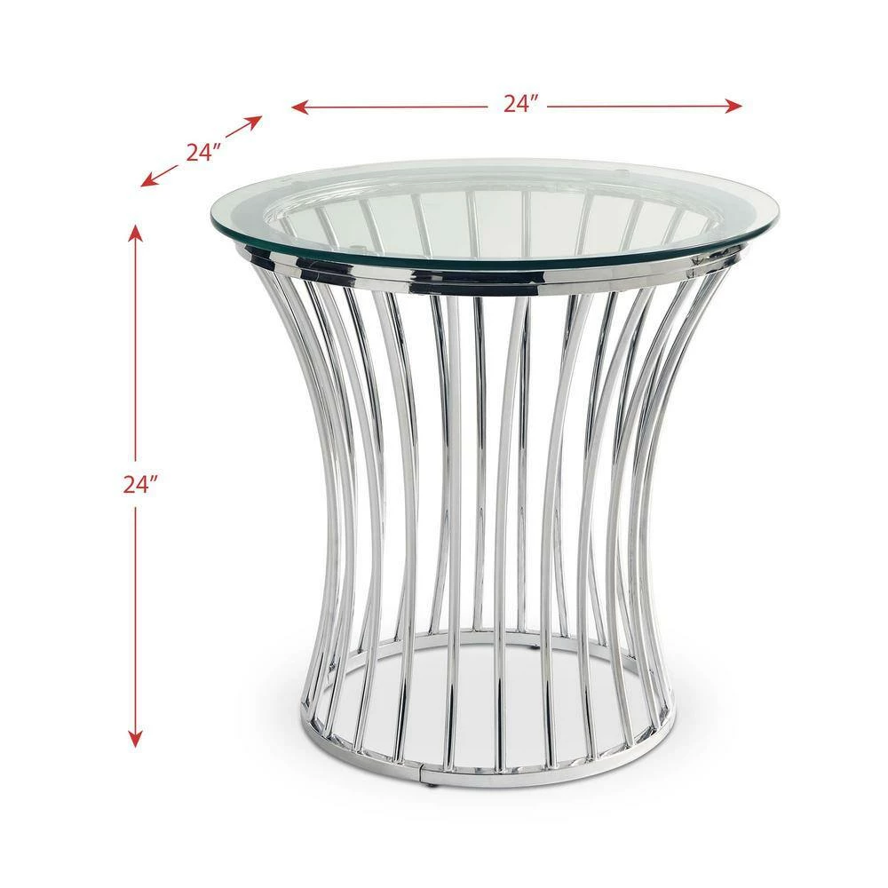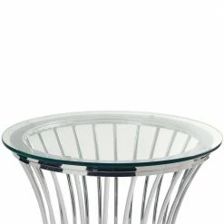 The Picket House Furnishings Astoria Round End Table is the accent piece your living space has been missing, This end table features a modern glam design, instantly adding a dash of luxury to your home. The glass table top pairs perfectly with the chrome finish, making this end table easily transitional with any space. The intricate work on the table base adds an element of drama and flair. This living room staple is perfect for small space living thanks to its tall and narrow design. Add this end table to your living space today for an ultra glam look.