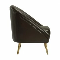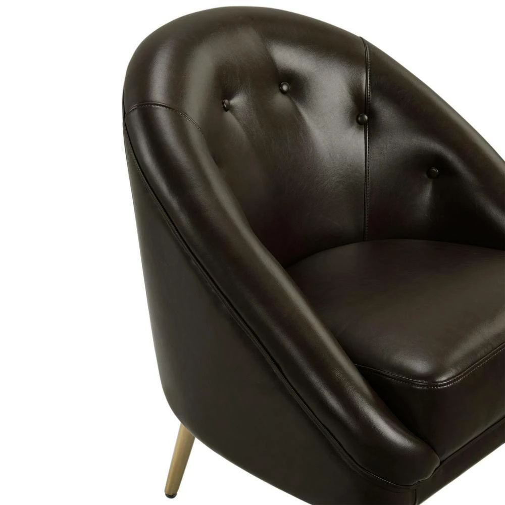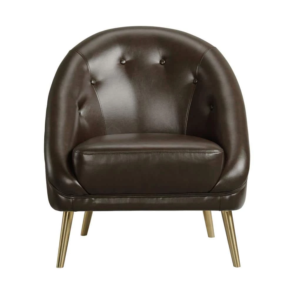 The Picket House Furnishings Taya Accent Chair is the perfect addition to your home. This chair will add instant glamour to your living room. Upholstered in faux leather and constructed in solid rubberwood and plywood. Featuring beautiful deep button tufting and a curved silhouette. Foam cushioning for all day enhanced comfort. Set on trendy, tapered gold metal legs. Complete the look of your home with the Taya Chair.