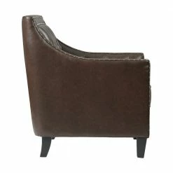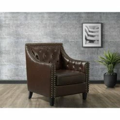 The Picket House Furnishings Tessa Accent Chair is the piece you’ve been missing. This chair is perfect for your modern home aesthetics. Crafted in plywood, rubberwood, and upholstered in soft faux leather fabric. Adds an interesting touch with its silver nail head trim and diamond tufting at back. Add the Tessa accent chair to your home for a modern touch.