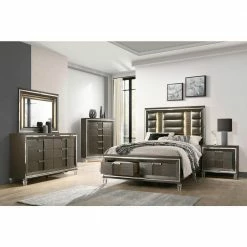 The Picket House Furnishings Charlotte King Storage 4-piece Bedroom Set is bedroom goals. This 4-piece set includes a platform storage bed, dresser, mirror and nightstand. The bed is not only gorgeous, but also super practical. The headboard and mirror feature an LED mood lighting, creating the perfect ambience while you wind down. The footboard comes with 2, spacious storage drawers making it easy to store away extra linens. The case pieces also offer plenty of storage space for your belongings. A cool feature the nightstand offers, 2 USB ports, which frees up 1 of your outlets and keeps your devices charged while you sleep. Mirror glass trim is present throughout the collection and clear, acrylic drawer pulls and feet complement the copper finish beautifully.
