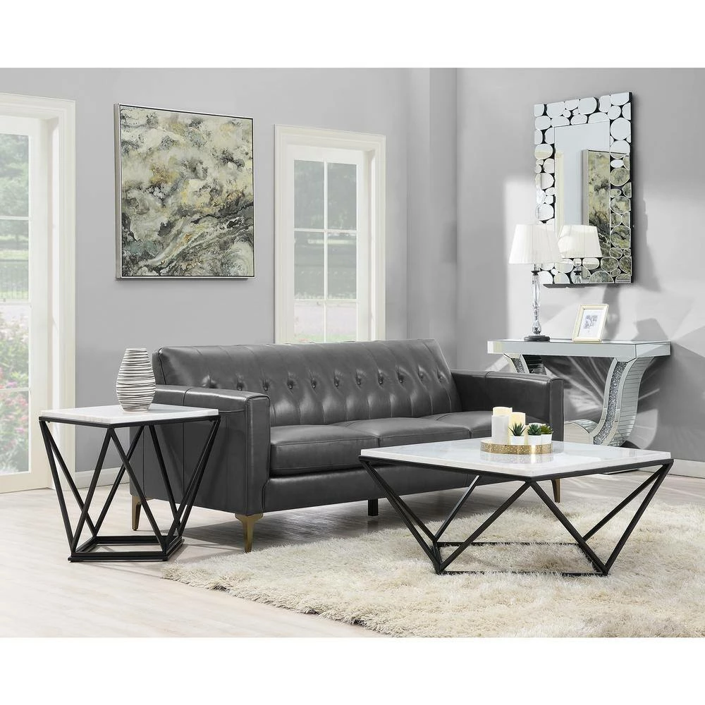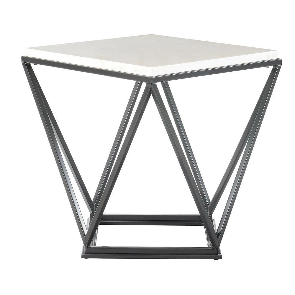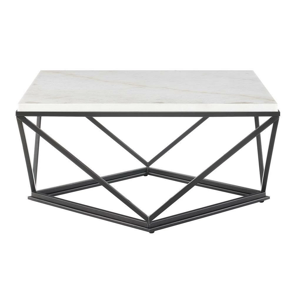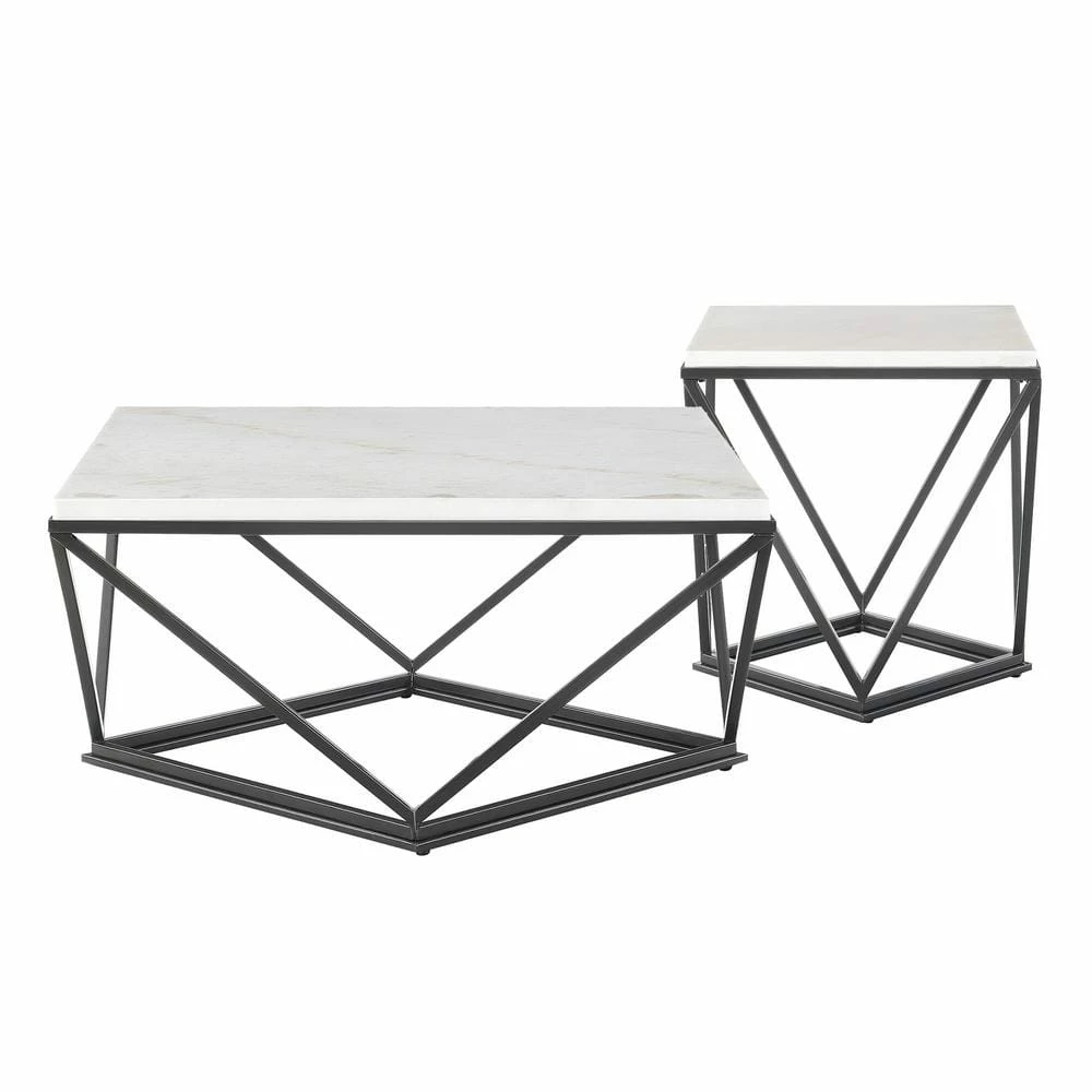The Picket house furnishings conner 2-piece occasional table set is the perfect addition to your home. This dynamic duo includes a coffee table and an end table. This set features crisp, white marble table tops that pair beauftifully with the balck powder coated, metal legs. A cool, funky design element is the table bases, adding extra flair to this already stunning set. The sleek, clean lines will make this duo a staple in your home year after year, even when your style changes.