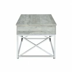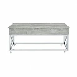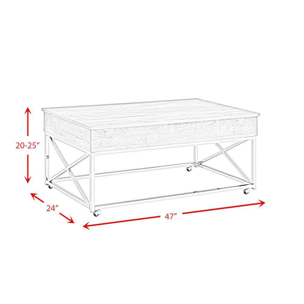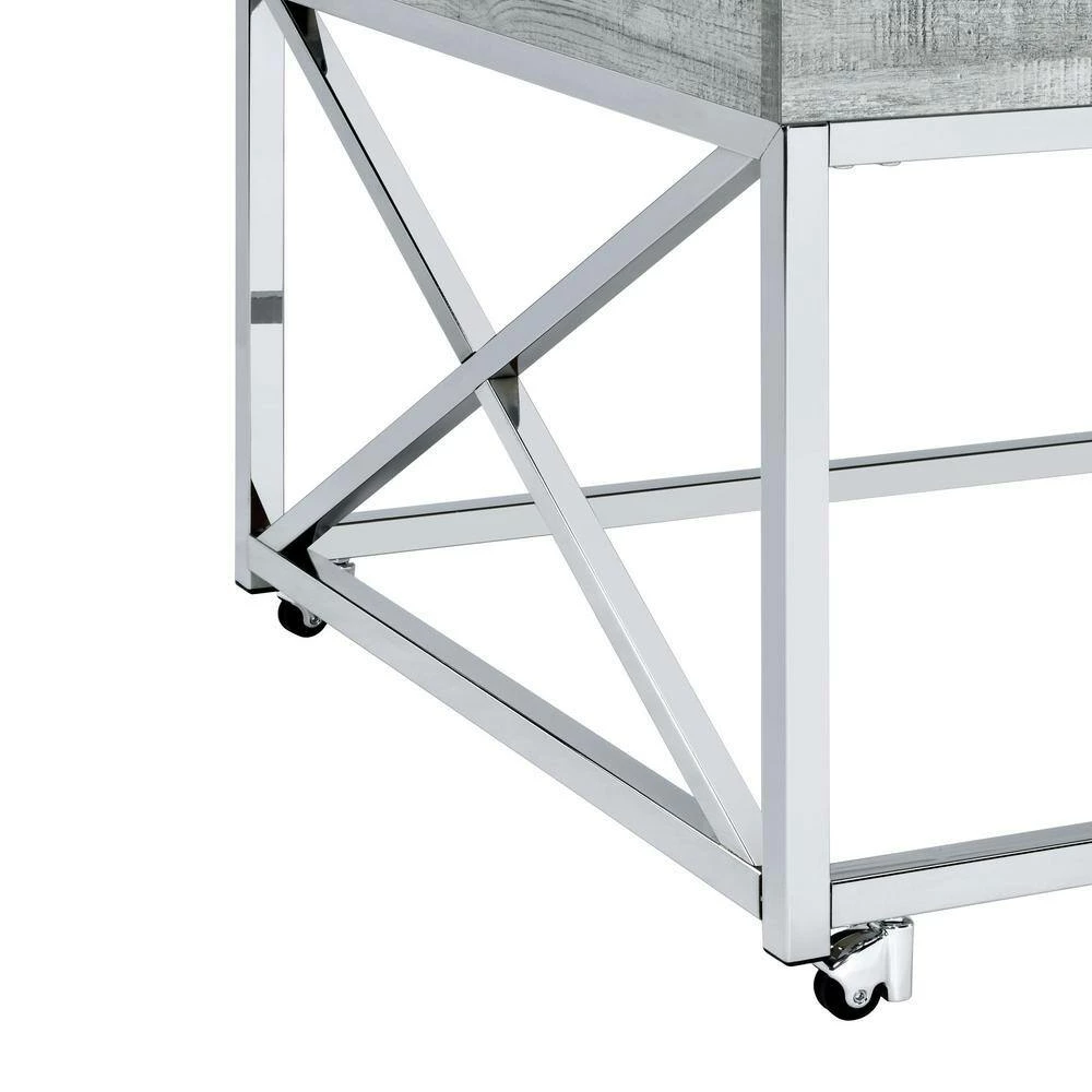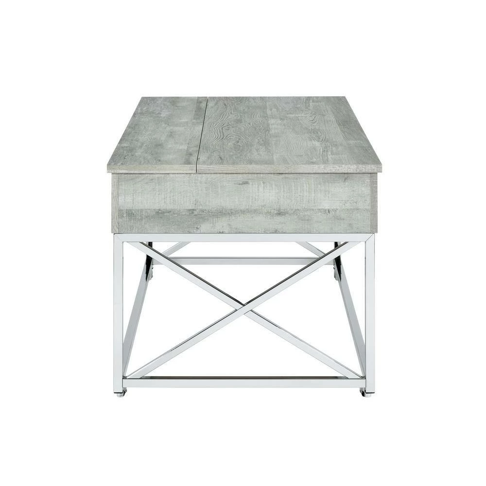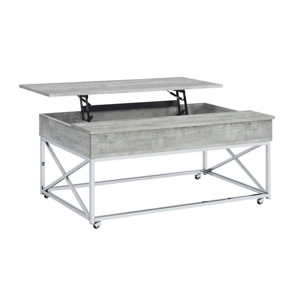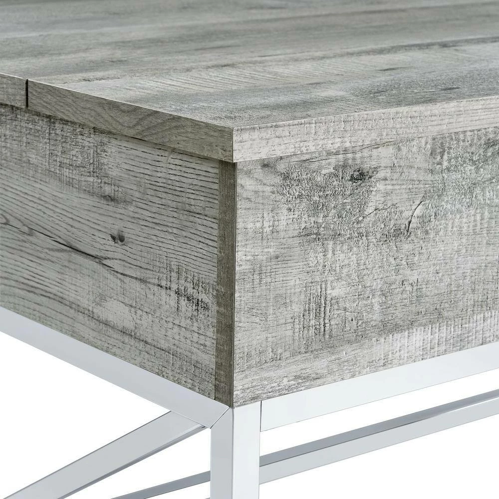The Picket House Furnishings Eliott Lift Top Coffee Table boasts the kind of convivence and style your living room needs. Featuring a weathered wood grain table top and a shining chrome base. The combination of the chrome and wood creates a cohesive look perfect for contemporary home styles. Raise the top to reveal extra storage, perfect for remotes or magazines. The table is sat atop four metal casters which makes it easier for mobility. The versatility of the Eliot coffee table makes it practical for everyday lounging, eating, or working from the comfort of your living room.