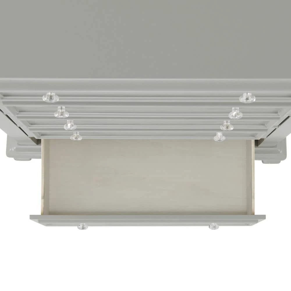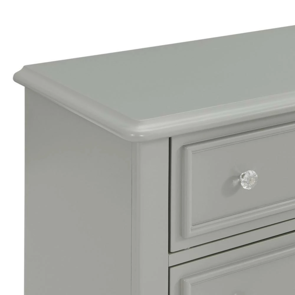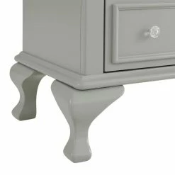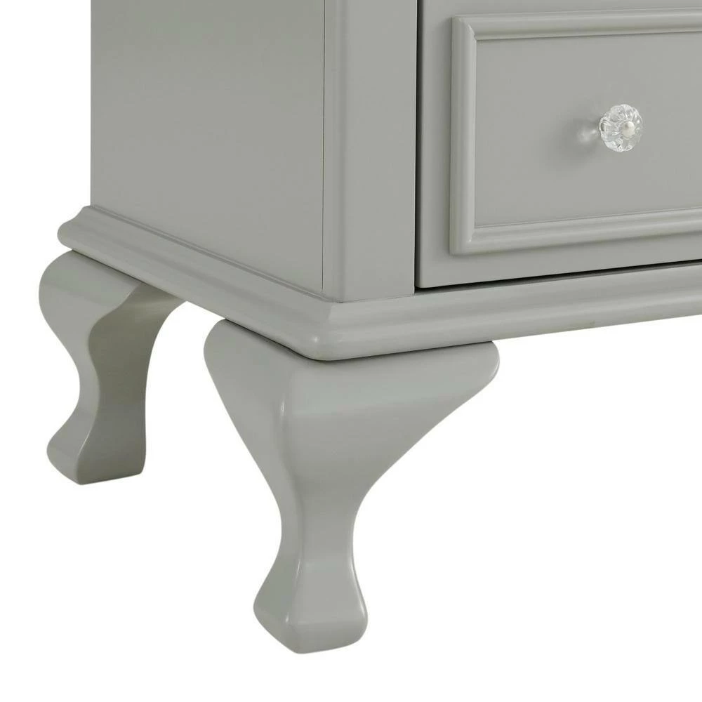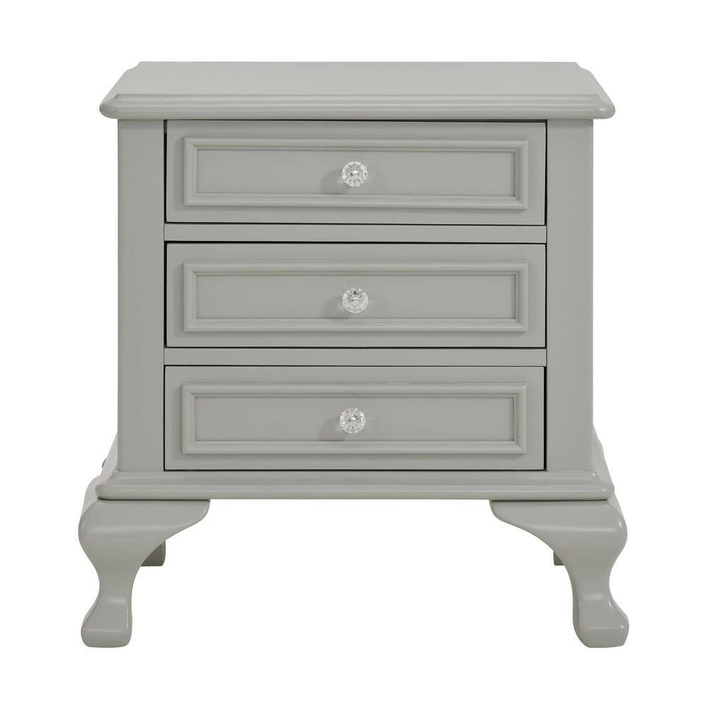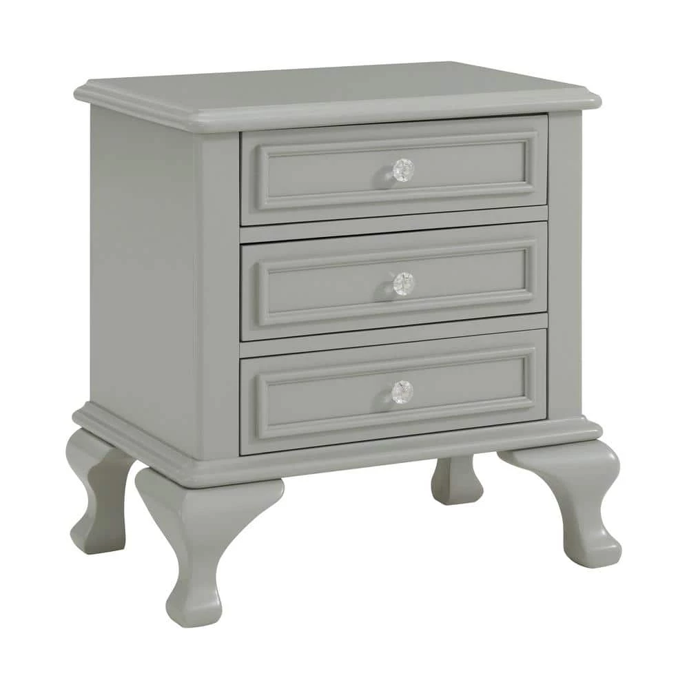 The Picket House Furnishings Jenna Nightstand features a charming design with delicate accents. Keep your little one organized with its three drawers. Perfect for storing all their special belongings. Raised panel drawer fronts are accompanied by crystal-like drawer knobs, adding an extra element of style to this already stylish set. The grey finish is easy to match with any existing decor. Bevel edges and arched cabriole feet complete the look of this transitional design.