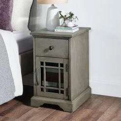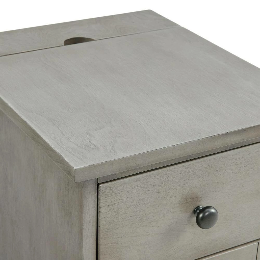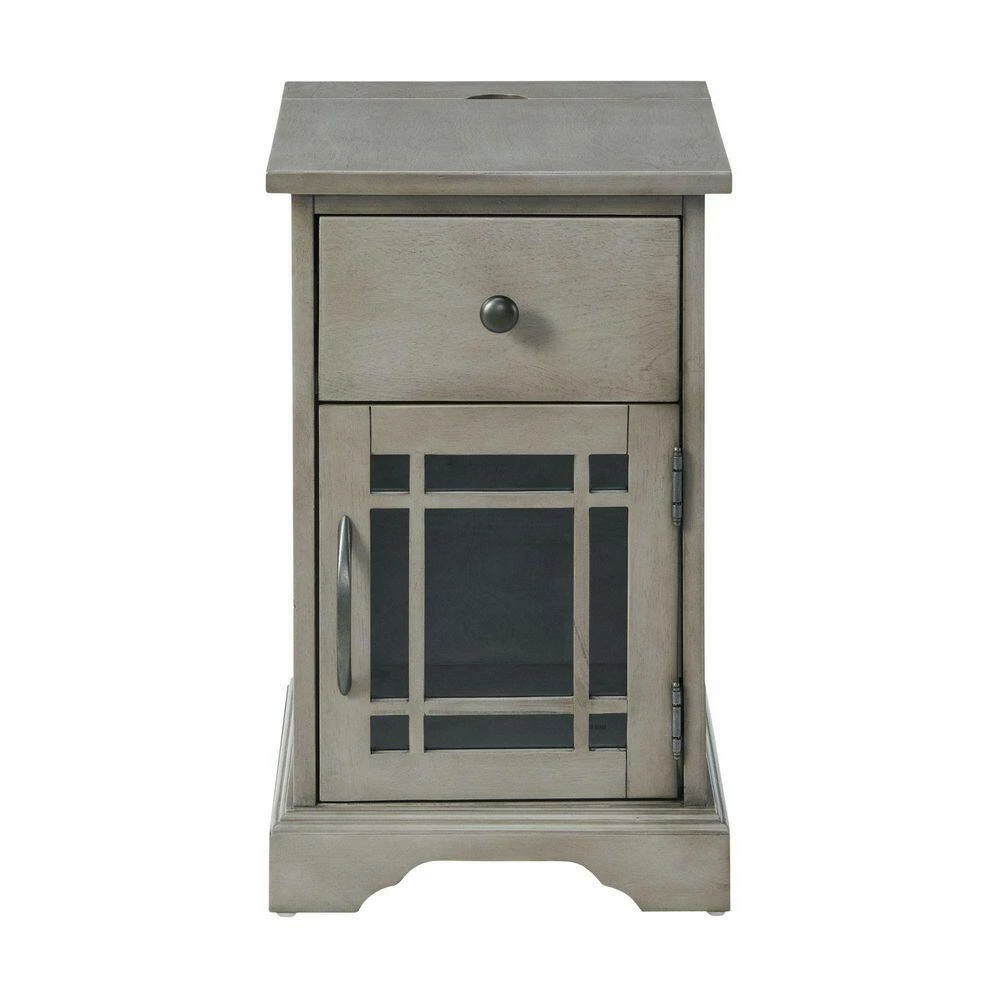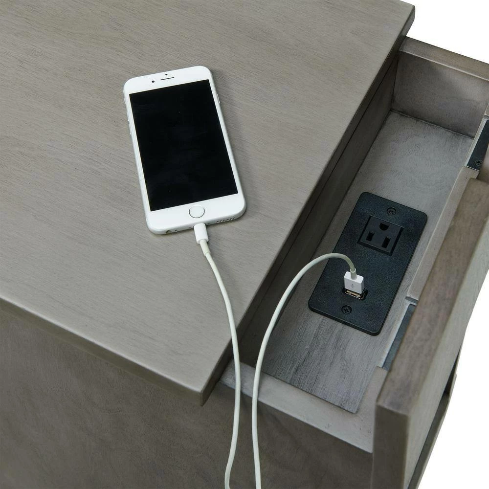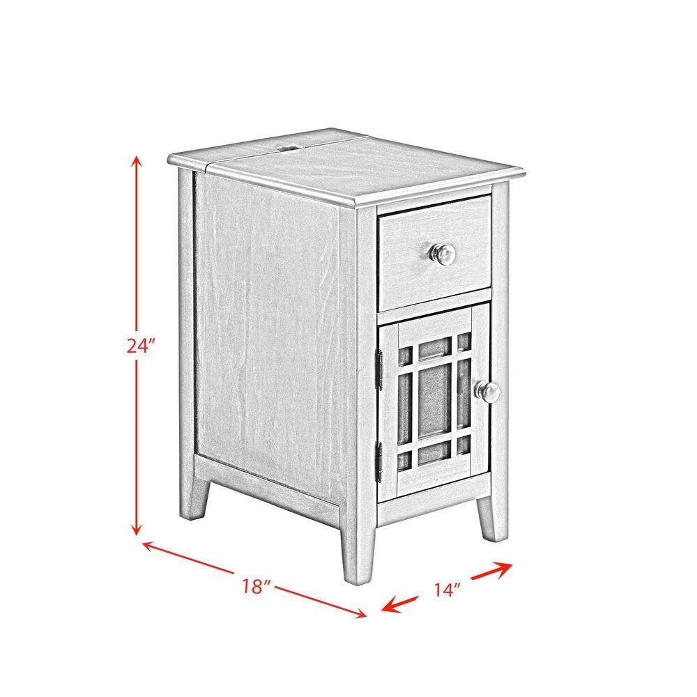 Picket House Furnishings Kian Side Table in Grey is the right fit for anywhere in your home. Designed with character and functionality. Crafted of sturdy solid wood and mdf. This side tables includes one spacious drawer, hidden storage under lift top, and tempered glass cabinet door. Also includes built-in USB outlet conveniently placed for keeping your devices charged at all times. Add a transitional touch to your home with the Kian Side Table.