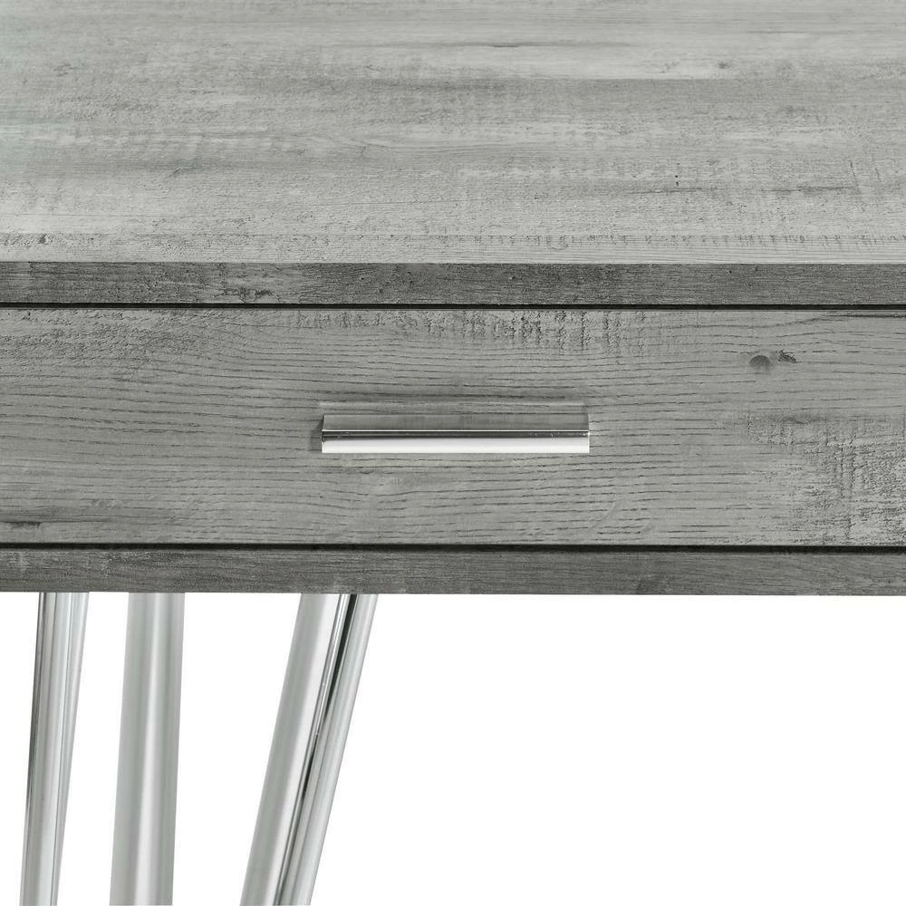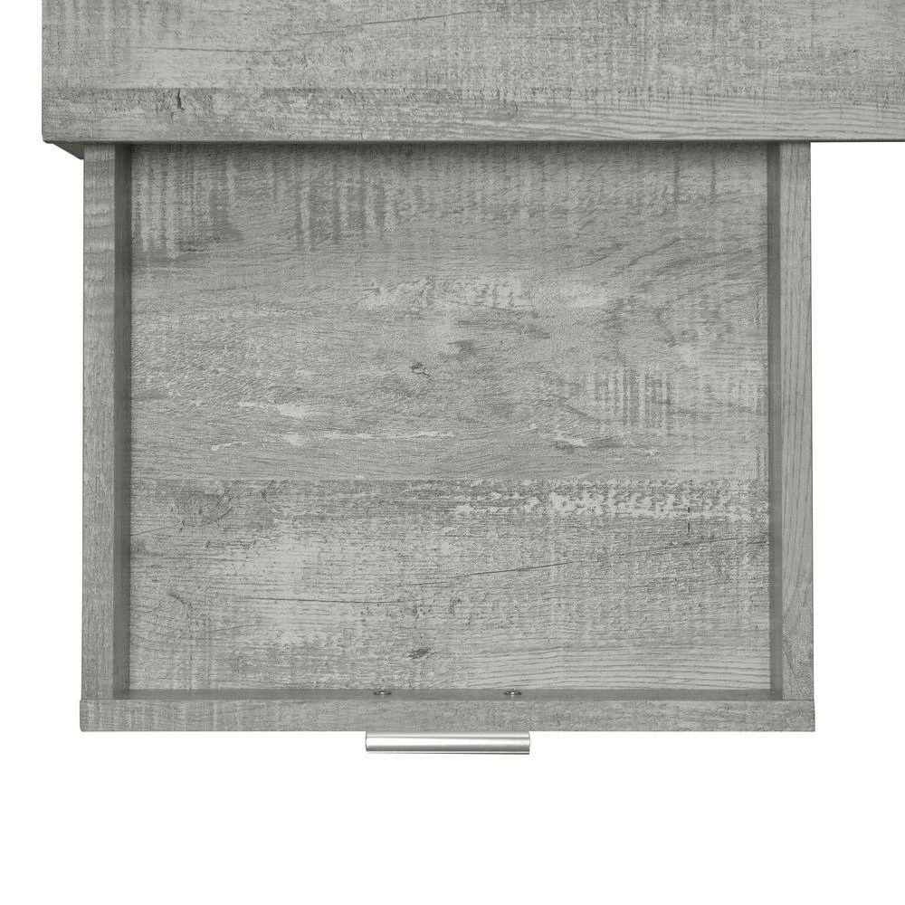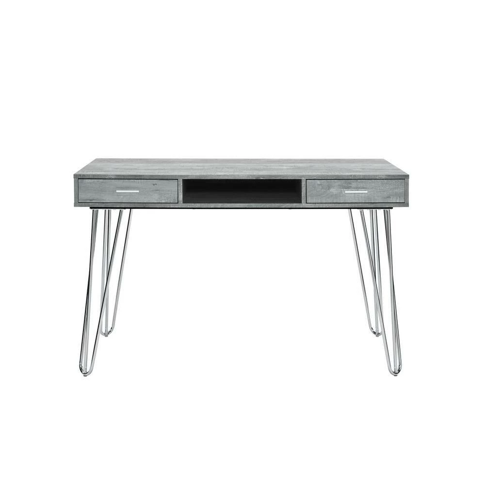 The Picket House Furnishings Lorain Desk will be a stand-out in your home office space. Mid-century inspired with a industrial edge. Crafted from particle board and paper with a neutral grey finish. Distressed detailing throughout desk creates rustic appeal and character. Built in open storage space underneath desk and two drawers for keeping your supplies in reach.