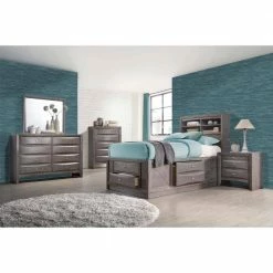 The Picket House Furnishings Madison Twin Storage 5PieceBedroom Set will keep you organized. Its contemporary, contoured drawers give it a custom look. Plenty of storage is provided throughout all case pieces as well as on all sides of the bed. This set is sure to add functionality and beauty to any room.