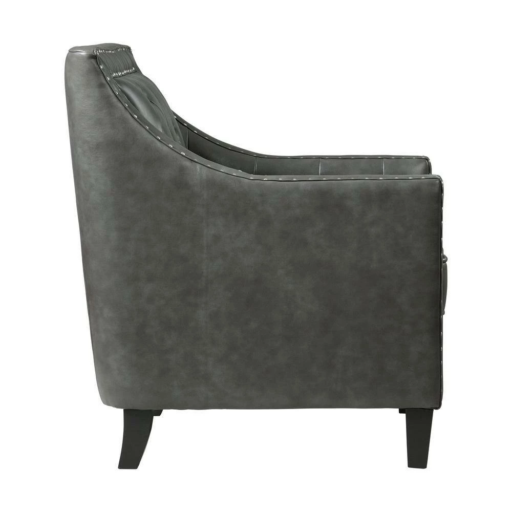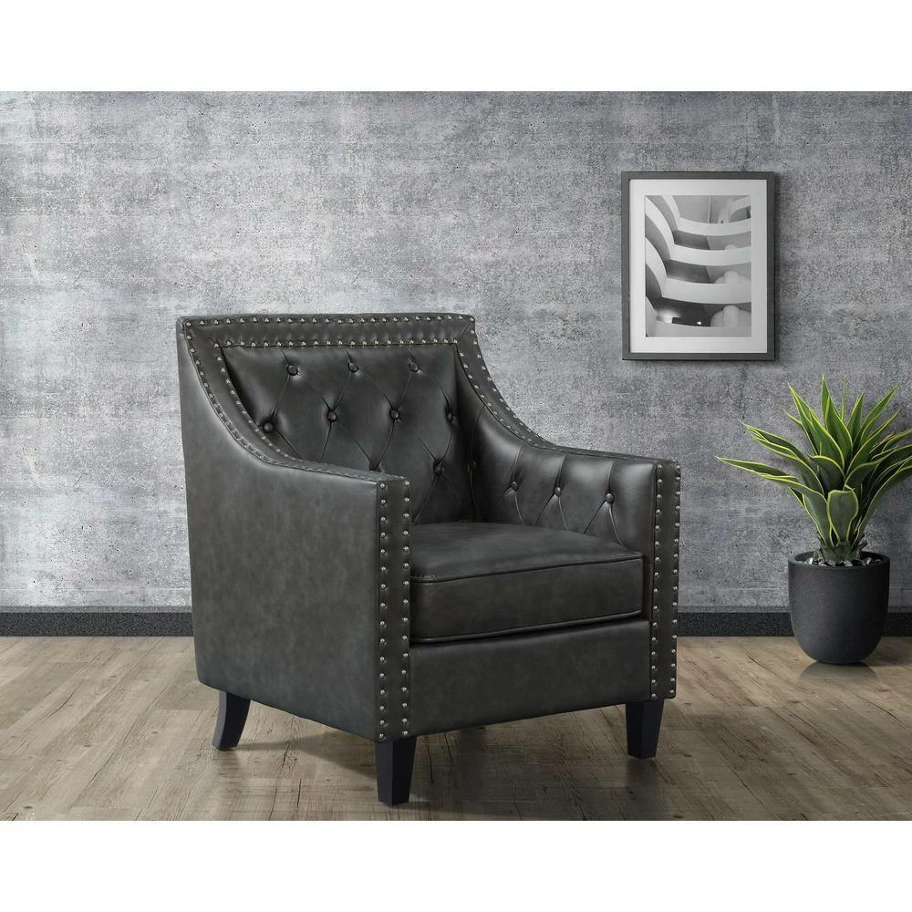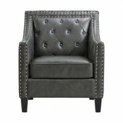 The Picket House Furnishings Tessa Accent Chair is the piece you’ve been missing. This chair is perfect for your modern home aesthetics. Crafted in plywood, rubberwood, and upholstered in soft faux leather fabric. Adds an interesting touch with its silver nail head trim and diamond tufting at back. Add the Tessa accent chair to your home for a modern touch.