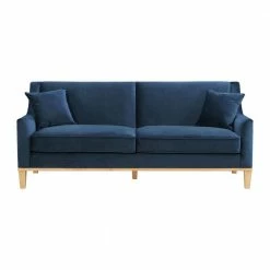 The Picket House Furnishings Moxie Sofa will be your new favorite place to come home to. Includes two decorative pillows, track arms, and wooden legs, this sofa adds a warm feel to any space. Upholstered in lush velvet fabric and carefully constructed with pine and plywood frame and situated on top of distressed wooden base. The high density foam makes this sofa perfect for all day lounging with family and friends. Perfectly seats two-three people and can be paired with an ottoman or accent chair.